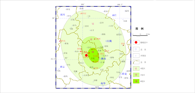 Ⅵ度區(qū)范圍:北自大姚縣三臺(tái)鎮(zhèn)樹(shù)吾打以北,南到南華縣城,東起大姚縣龍街鄉(xiāng)設(shè)甸村,西近賓川縣雄魯么村,總面積約5845平方千米。