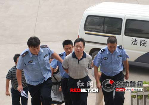 8日上午9時40分,龍國華被法警押送到湘潭市中院第一審判庭的被告席上,開始接受審判。