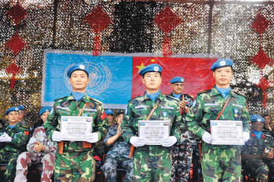 在國際維和戰(zhàn)場上,中國維和軍人還充當(dāng)了“文化使者”。在蘇丹,維和軍人長期把紅燈籠、中國結(jié)、四大發(fā)明和文房四寶的招貼畫等放在營區(qū)展示,還利用國慶招待會、新春招待會、授勛、迎奧運(yùn)多國運(yùn)動會等時機(jī),播放反映中國人文風(fēng)情、改革開放成果的宣傳片。