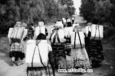剛到村口,記者發(fā)現(xiàn),身著苗族服裝的20多位婦女正坐在樹下。“她們在等著背水”,熱水鎮(zhèn)的負責(zé)人告訴記者。此時,一輛裝有20多桶水的貨車到達村口。