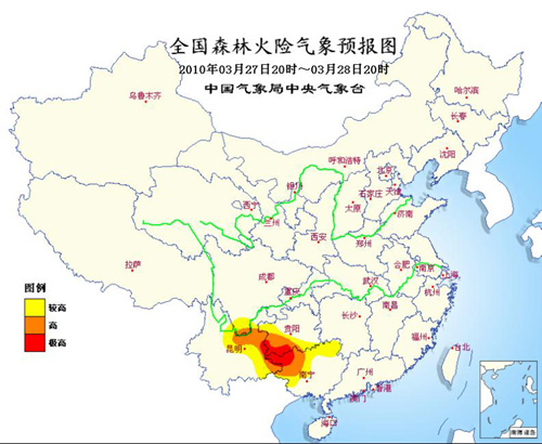 中新網3月27日電 中央氣象臺27日17時發布森林火險氣象警報:根據最新的全國熱源點監測資料顯示(2010年3月26日16時至2010年3月27日16時),黑龍江、吉林、內蒙古、河北、河南、湖北、湖南、江西、廣東、廣西、貴州、云南監測到熱源點。