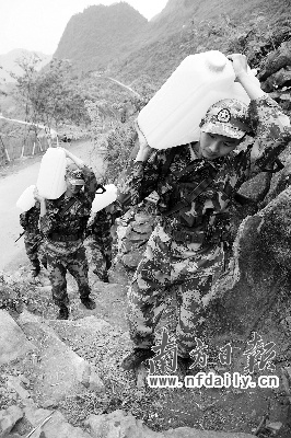 告別巖門屯許大媽家時,已是中午1時多,官兵們顧不上吃午飯,拎著空桶又急匆匆向山下走去,他們要在就近的山澗采集清泉,為給下一個村的老百姓送水爭取時間……(南方日報特派記者洪奕宜 通訊員李三紅 發自廣西百色)