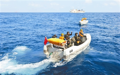 4月11日,海軍第五批護航編隊的特戰隊員乘小艇前往被護商船 曹海華攝
