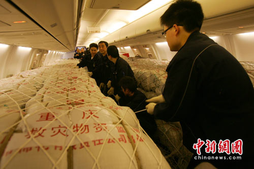 截至15日17時,中共重慶市委、市政府組織的第二批救災物資已經運抵重慶機場,由國航重慶分公司的波音737-800執行飛行任務準備運往災區。而重慶機場已在下午開始對首批救援物資進行裝載,包括1萬床棉被、2500件棉大衣、3130件防寒服、500件兒童羽絨服、20件應急燈和160臺發電機等。完