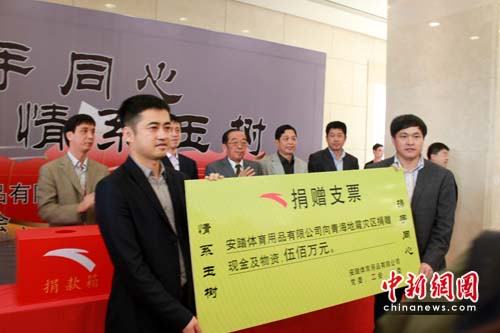 青海省玉樹藏族自治州玉樹縣4月14日發生7.1級地震,災情牽動著所有人的心。“我們的幫助,可能無法讓受災人民馬上擺脫困境”, 安踏體育董事局主席兼首席執行官丁世忠先生告訴記者,“但是我相信,我們的一份援助,將給災區人民十分的力量;我們的十分幫助,將給災區人民百倍的信心”。作為中國本土體育用品的代表品牌,安踏公司長期以來對慈善事業傾情關注、投入,被中國民政部授予“中華慈善獎”。