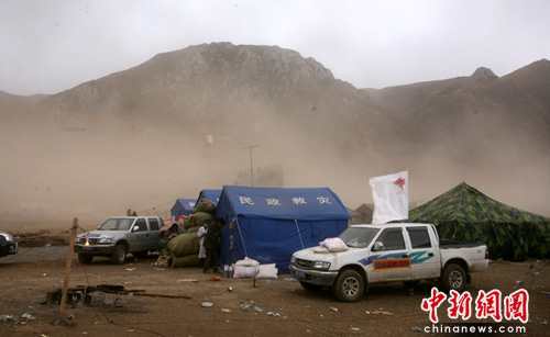 中新網青海玉樹4月19日電(記者劉忠俊)19日14:36分,青海玉樹地震災區天氣突變,由晴天轉變為陰天,現場掛起了大風,天空撒起了雨點。