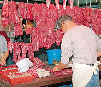 中新網11月24日電 香港《星島日報》今日在頭條刊發報道稱,香港牛肉格價持續飆升,不法肉販為賺取厚利,不惜以冷藏牛肉充當新鮮牛肉出售,他們為令肉色更“逼真”,竟將致癌物二氧化硫灑于肉上。