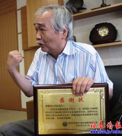 “日本百名漫畫家筆下的8·15”展覽至今年7月31日結(jié)束,歷時(shí)351天,觀眾高達(dá)240多萬人次。8月5日,侵華日軍南京大屠殺遇難同胞紀(jì)念館特地為石川好等頒發(fā)了感謝狀。