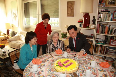 韓女士雖已年逾九十高齡,但精神矍鑠、談吐流利,依然時刻關注著中國的進步和發展。在交談中,她衷心感謝吳大使夫婦專程趕來洛桑為其慶生,表示,使館的惦記和關懷讓她感到無比溫馨。她祝祖國繁榮昌盛,人民幸福安康。