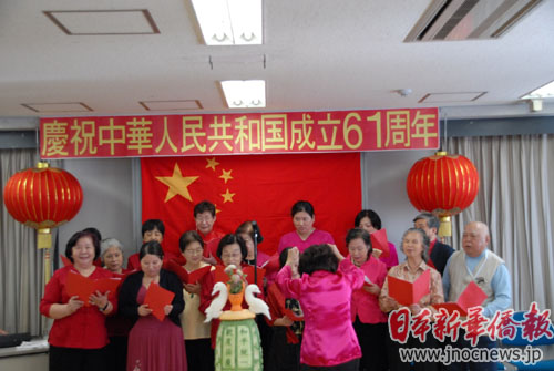 東京各界華僑和應(yīng)邀前來參加活動(dòng)的日中友好會(huì)館、在日朝鮮人總聯(lián)合會(huì)、在日大韓民國(guó)民團(tuán)、日本新華僑華人會(huì)、在日中國(guó)企業(yè)協(xié)會(huì)、日本中華總商會(huì)、橫浜華僑總會(huì)、長(zhǎng)野華僑總會(huì)等團(tuán)體在中華人民共和國(guó)61年國(guó)慶前夕齊聚一堂,華人華僑的愛國(guó)思鄉(xiāng)之情涌上心頭。席間,東京華僑婦女會(huì)會(huì)長(zhǎng)吳少煖帶領(lǐng)婦女會(huì)員們?yōu)榇髸?huì)獻(xiàn)唱一曲《五星紅旗》,不僅抒發(fā)了大家思念之情,更激發(fā)了眾人的愛國(guó)激情。吳少煖包含激情地表示:“我們獨(dú)在異鄉(xiāng)為異客,每逢佳節(jié)倍思親。雖然身在異鄉(xiāng),但是思念祖國(guó)的心是一直沒有改變過的。望祖國(guó)今后更加繁榮富強(qiáng)。”