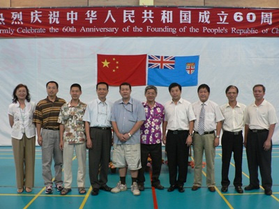 中新網9月21日電 據中國外交部網站消息,20日上午,座落在斐濟首都蘇瓦的華人學校斐濟逸仙學校禮堂座無虛席,600多華人華僑和中資機構代表濟濟一堂,出席斐濟中國和平統一促進會和華人協會聯合舉辦的慶祝中華人民共和國成立60周年升旗儀式和文體活動。活動在莊嚴的中斐國歌聲中開始。韓志強大使及和統會會長袁炳棠和華人協會會長司徒新耀分別發表了熱情洋溢的致辭。