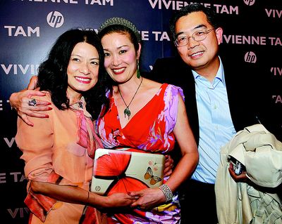 譚燕玉(圖左)以梁祝的蝴蝶雙飛當設計主題,展后拿著HP筆記型計算機與朋友開心慶賀。 (美國《世界日報》/簡一夫攝影)