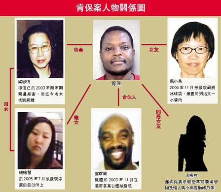 2004年11月,肯保的55歲情人馬小燕被發(fā)現(xiàn)藏尸冰球袋,棄置于列治文一水溝內(nèi),死因?yàn)橛瞿缁蛑舷ⅰz控官指肯保開始時堅(jiān)稱不認(rèn)識馬小燕,當(dāng)警方檢驗(yàn)出馬小燕家中的潤滑劑內(nèi)有二人DNA時,才改口承認(rèn)二人是情人關(guān)系。