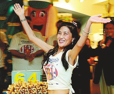 看過李蕙比賽的人都難以理解:她五尺出頭、腰細(xì)得只能穿零號牛仔褲的小女子,怎么能和那些五大三粗的猛男們競爭大胃王的寶座?不論是連續(xù)兩年在紐約著名的國慶節(jié)吃熱狗大賽中,還是在各地的競吃賽場,觀眾們對參賽的大漢們興趣平平,但對身穿露肚臍短款T恤、腰間沒有半點松皮和贅肉的44歲辣媽卻情有獨(dú)鐘,都爭先恐后與她拍照留念。