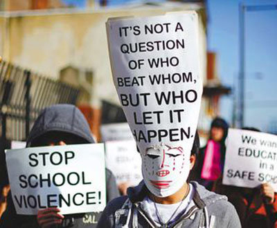 中新網(wǎng)1月8日電 美國(guó)南費(fèi)城高中上個(gè)月初發(fā)生的非洲裔學(xué)生集體攻擊亞裔學(xué)生的事件,造成了26名學(xué)生受傷、其中7人須送醫(yī)治療,這引起各界關(guān)注,同時(shí)也使種族問(wèn)題再被提及。據(jù)美國(guó)《華盛頓觀(guān)察》7日?qǐng)?bào)道,此次校園暴力事件,學(xué)生抨擊是學(xué)校長(zhǎng)期忽視校園種族沖突所致,因而罷課表達(dá)不滿(mǎn)。教育專(zhuān)家認(rèn)為,學(xué)校和社會(huì)都應(yīng)該更坦誠(chéng)地談?wù)摲N族問(wèn)題,才能使青少年有正確的態(tài)度。