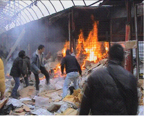 當地時間中午11時半,在羅馬尼亞稅務總局警察對尼羅市場的玩具區進行封鎖大約10分鐘后,挨著玩具區的垃圾堆突然起火,火勢迅速竄升至4米左右。100余名市場華商及各國商人拿著滅火器、水盆等紛紛趕來救火,火被迅速撲滅。這時候現場開始混亂,有沖動的商戶向警察扔紙箱,警察也拿著警棍驅趕市場商戶,沒料想未被完全撲滅的余火忽又燃燒起來,火勢開始蔓延,現場人們重又投入救火之中。中國駐羅使館有關人員及市場維權委員會負責人潘繼東等人趕到調解,混亂稍稍平息。據知,火災沒有造成重大損失。