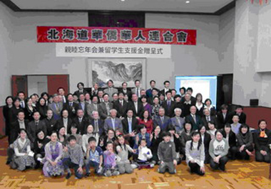 北海道華人華僑聯合會舉辦忘年會,并舉行留學生獎學金頒發儀式。會后,大家合影留念。(日本新華僑報網圖片)