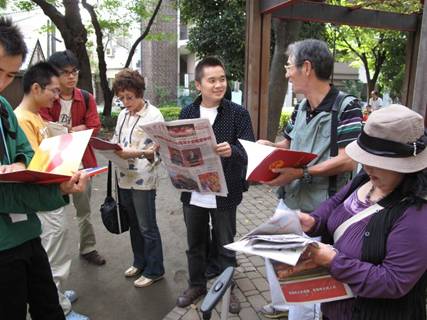 10月4日,日本僑報社創辦的星期日漢語角舉行第109次交流會。會上,剛剛從北京參加國慶觀禮回來的日本僑報社總編輯、日本湖南人會會長段躍中,向漢語角參加者介紹了10月1日在天安門廣場舉行的中國建國60周年紀念大會等一系列國慶活動,還傳閱了中國60華誕慶典的有關報道,欣賞了國慶專題郵票。