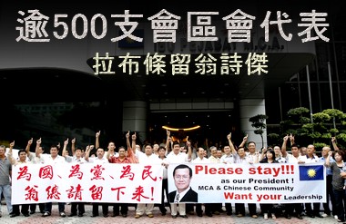 中新網(wǎng)10月15日電 據(jù)馬來(lái)西亞《星洲日?qǐng)?bào)》報(bào)道,馬華支會(huì)和區(qū)會(huì)逾500名代表,15日拉起13條巨幅布條表達(dá)心聲,以期力挽總會(huì)長(zhǎng)翁詩(shī)杰留下,繼續(xù)領(lǐng)導(dǎo)馬華進(jìn)行改革。