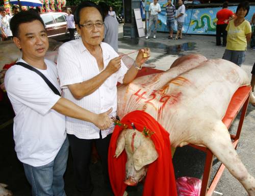 他說,由于早前附近都是從事養豬業,生豬大賽旨在聯誼居民,讓大家促進交情。祭拜儀式完畢后,所有的生豬將全數切割分發給民眾。