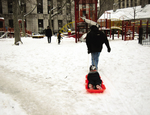 大雪孩子不用上學,家長帶著小朋友在公園玩自制雪撬。(美國《僑報》/葉永康 攝)
