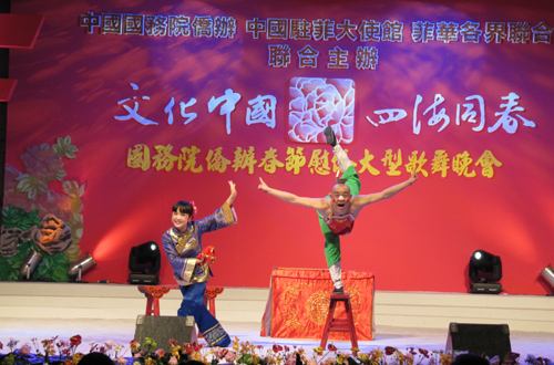 中新網2月25日電 由國務院僑辦和中國海外交流協會組派的“文化中國·四海同春”2010年春節赴菲律賓藝術小組在宿務進行了精彩的演出。濃郁的民俗文化氣息,精湛的演藝水平,受到了當地僑胞的極大贊譽。