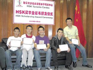郭凌清、李賦涵、張庭、黃帝鈞、張龍江五位同學(xué),都在去年參加由加拿大多倫多漢語(yǔ)水平考試中心主辦的中國(guó)國(guó)家漢語(yǔ)水平考試,并取得優(yōu)異成績(jī)。4日他們?cè)谟H友和家長(zhǎng)的陪同下,領(lǐng)取國(guó)家漢辦孔子學(xué)院獎(jiǎng)學(xué)金證書(shū),并暢談暑期前往中國(guó)學(xué)習(xí)漢語(yǔ)的美妙經(jīng)歷。
