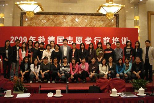 國家漢辦12日為該批志愿者組織了行前培訓(xùn)并為他們送行。志愿者中心主任薛華領(lǐng)勉勵志愿者們繼承漢語教師志愿者兢兢業(yè)業(yè)、克己奉獻(xiàn)的優(yōu)良作風(fēng),發(fā)揚志愿精神,高標(biāo)準(zhǔn)要求自己,做好志愿服務(wù)工作。同時也希望志愿者們牢記漢語教師志愿者的“光榮感、責(zé)任感、使命感”,進(jìn)一步提高自身素質(zhì),關(guān)心國家大事,在新中國60華誕之際,抓住機(jī)遇,展示祖國的偉大成就,為中德友好交流做出貢獻(xiàn)。志愿者們紛紛表示,祖國的崛起與富強堅定了他們當(dāng)好文化傳播民間使者的信心和決心,激勵著他們投身到漢語國際推廣事業(yè)的最前沿隊伍中去,把工作做得更好、更精彩。