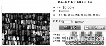 近日,店主“千尋kission”在淘寶網(wǎng)上發(fā)布了“磚頭大甩賣(mài),玩死快遞公司專(zhuān)用”的銷(xiāo)售標(biāo)題,表示將以5元一斤的價(jià)格販賣(mài)磚頭。其中的產(chǎn)品說(shuō)明還頗有幾分《武林外傳》中呂秀才的風(fēng)采:“泄憤也可用磚頭,本磚頭專(zhuān)為對(duì)付那些服務(wù)態(tài)度不好的快遞送貨員設(shè)計(jì),如果你們對(duì)那些惹您生氣的快遞員投訴無(wú)門(mén),無(wú)處泄憤請(qǐng)拍下此產(chǎn)品。”