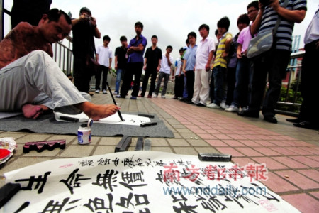 富士康先后發(fā)生“九連跳”,正當(dāng)社會(huì)學(xué)家以及各界紛紛出來(lái)指出富士康公司種種問(wèn)題時(shí),昨日,有腳書(shū)絕技的殘疾人郭乙傳,到富士康大門(mén)外天橋上寫(xiě)勵(lì)志語(yǔ)“盡孝應(yīng)先,和諧靠己”。中午一小時(shí)內(nèi),郭乙傳贈(zèng)送出5幅字幅。