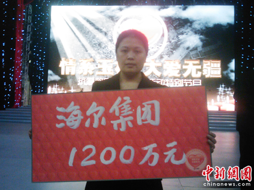 中新網4月21日電 4月20日,由中宣部、國家廣電總局、民政部、中國紅十字會主辦,中央電視臺承辦的《情系玉樹 大愛無疆--抗震救災大型募捐活動特別節目》在中央電視臺現場直播。海爾集團在現場向災區捐款1200萬元,全力支持災區緊急救災和災后重建工作。