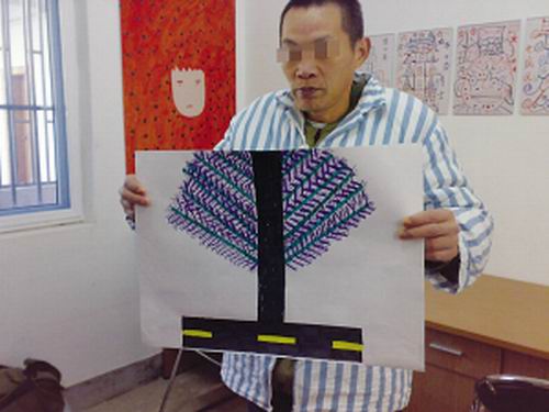 昨天(12月24日)下午兩點鐘的光景,在所有當時參加郭海平實驗項目中繪畫水平最令人驚嘆的張金寶和另兩位也畫得很出色的同伴王軍、張兵一起,在祖堂山精神病院八病區懶懶地曬著太陽。“又可以畫畫了,我就不出去找老婆了”,張金寶入院后,同樣有精神病癥狀的愛人離家走失了,他老念想著要出院去找她。