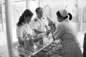 昨日10時(shí)許,記者與朝陽(yáng)區(qū)衛(wèi)生局衛(wèi)生監(jiān)督所的執(zhí)法人員來(lái)到位于南湖大路一工地附近的瑞豐大藥房,這是一間規(guī)模較小的藥房,但藥房里擺放的藥品種類卻不少,據(jù)藥房?jī)?nèi)的售藥人員介紹,店里的消毒藥主要賣(mài)給附近的農(nóng)民工。