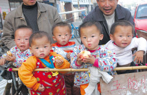 昨日上午,河南鄭密路與淮河路交會處農(nóng)貿(mào)市場門口,約一歲半的五胞胎繞著一輛小推車嬉笑打鬧,吸引路人紛紛駐足。三男二女,名叫貝貝、晶晶、歡歡、迎迎和妮妮,與奧運(yùn)吉祥物五福娃同名。