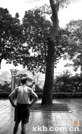 下午5時25分,記者趕到事發現場,在離公園入口約150米處的一棵樹下有大一攤血跡,旁邊有兩個塑料袋。這棵鳳凰樹高約20米、直徑約20厘米,沒有明顯雷擊痕跡。幾位市民正拍著胸口在驚嘆自己險些遭到雷擊。