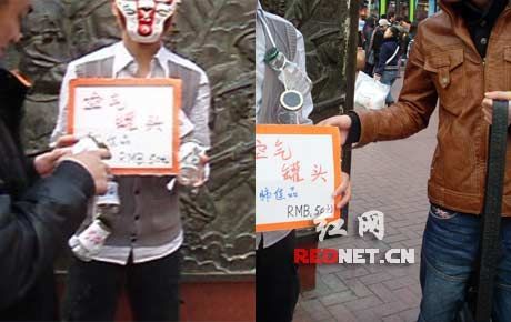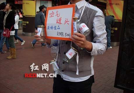 “發(fā)寶氣的吧?太扯淡了,竟然叫賣空氣!”23日傍晚,網(wǎng)友“閃賞”在紅網(wǎng)論壇發(fā)帖爆料,稱自己當(dāng)天下午在長(zhǎng)沙黃興路步行街逛街,在黃興銅像旁看到一男子臉上戴著面具,全身掛滿了寫著陽(yáng)朔、三亞、可可西里、九寨溝字樣的玻璃瓶,手舉“空氣罐頭,50元”的紙牌,引來(lái)不少人圍觀。男子自稱空氣是從全國(guó)各地方收集來(lái)的,屬他勞動(dòng)成果,所以他有理由出售而贏利。