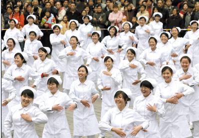 昨日,解放碑,300護士跳“乳房保健操”。解放碑中心廣場音樂飛揚,一群“護士小姐”排著整齊的隊伍,擴胸、伸展、按摩……一個個優(yōu)雅但不失力度的動作,展示著健康的活力。隊伍的表演吸引著大批過往的行人駐足觀看。原來,在三八婦女節(jié)到來之際,為響應重慶市委市政府建設“健康重慶”的號召,醫(yī)護人員舉辦了“健康重慶,關愛婦女”大型公益活動。現(xiàn)場二十名專家的義診活動,巧妙地向市民傳達乳腺保健的意識以及日常防病治病的知識。(記者 劉嵩 攝影報道)