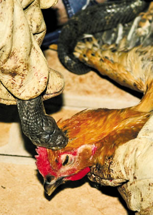 “表演馬上開始!”店里所有顧客都將眼光齊刷刷地盯著該男子的手。只見他左手將母雞死死按在地上,右手從鐵籠中隨手抓了一條長約1米的眼鏡蛇,用手卡住它的頸部!芭尽⑴尽⑴荆 敝灰娔袕N師不停地拍打著蛇的頭部,試圖激怒它,但眼鏡蛇仍一動不動。“怎么不咬呢?”幾名男子哈哈大笑,一些食客也一撥接一撥地走了進來。