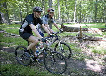 美國總統和丹麥首相拉斯姆森一起騎車。后者曾嘗試了去年環法自行車賽的一段艱難上坡路段。