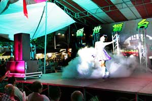 七月歌臺的燈光璀璨奪目,一身閃耀裝扮的歌手落力地勁歌熱舞,臺下觀眾有些閑坐在椅子上觀賞,更多是站在一旁湊熱鬧聽歌的。只見有個身影穿梭在喧鬧的人群中,手持著半專業型相機正在專心攝影,為歷史留下紀錄。