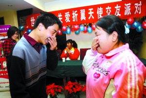 昨日上午10時(shí),相親會(huì)正式開始。50余名殘疾人拿起小紙條,填上基本情況后,跟著主持人玩起“幸福拍手”游戲,他們希望遇到屬于自己的緣分。
