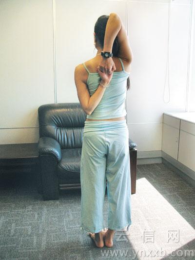 動作要領:站立或坐在椅子上,保持脊背直立,把右臂高舉過頭,彎曲右肘,試圖把右手放到兩肩胛骨之間。放下左臂,彎曲左肘,把左前臂收向背部,直到右手手指能和左手手指相扣。正常呼吸,保持姿勢5-20秒鐘,然后換方向重復動作。別看很簡單,做起來難度很大的哦!