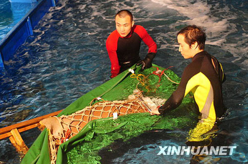 當日晚,廣東省漁政部門從廣州一家酒樓解救出一條護士鯊,并將其送到廣東省水生野生動物救護基地。據(jù)悉,此護士鯊為廣州某酒樓從水產(chǎn)市場購得,在酒樓水族箱里展示,接受食客們的預定。環(huán)保人士獲知后前往酒樓抗議護鯊,漁政部門隨即前往酒樓將其救出。護士鯊屬于廣東省野生保護動物,受到廣東地方保護法保護。新華社記者 盧漢欣 攝