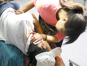 昨日下午3點多鐘,脖子血流不止的周方被救護車送進市急救中心后拒絕進入急診室接受治療。記者看到,周方的脖子左側有一道長約6公分的刀傷,鮮血直流,染紅了白色T恤和頭上的棒球帽。醫護人員和匡非好不容易將他勸進去,他卻趴在病床上痛哭不已,約10分鐘后,才平靜下來,接受了縫合處理。據醫生介紹,周方的傷口淺,未傷及主動脈,無生命危險。