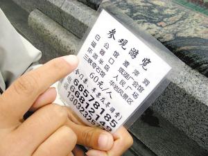 “一日游,60塊錢。馬上就可以走。”一名婦女湊上來,還揚起手中的一張紙片,上面印有參觀行程:白公館、渣滓洞、磁器口或湖廣會館、環游半島、人民廣場、三峽奇石館、華巖風景區(含門票、車費、導游費)。
