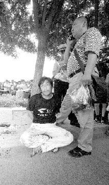 昨日9時(shí)45分,記者趕到京廣南路中陸物流廣場(chǎng)西側(cè)的馬路邊,一名穿著白褲子的男子目光呆滯地坐在路邊,他身上多處被鮮血染紅。特巡警三大隊(duì)民警已經(jīng)將其控制,急救人員正在給他包扎右手上的傷口。