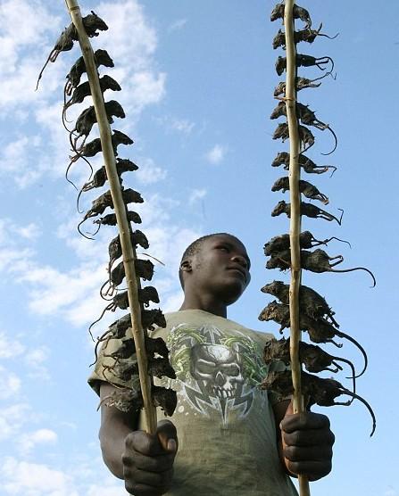 馬拉維當地青年將烤好的田鼠串成串,沿街叫賣