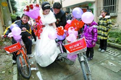 “四輪車人人結婚都會乘,兩個輪子的就少見了吧。 ”新郎孫軍說,現在政府提倡節能以保護環境,用租賃自行車迎親,既響應了政府號召,又降低了婚禮成本。并且這種形式與眾不同,非常有紀念意義。新郎新娘都姓孫,在同一家房地產公司工作,在商量婚事時,新娘希望能用一種別樣的方式來紀念他們的特殊緣分,于是這個自行車迎親方案立即得到了大家的青睞,“很特別,能讓人記一輩子”,新娘笑著說。