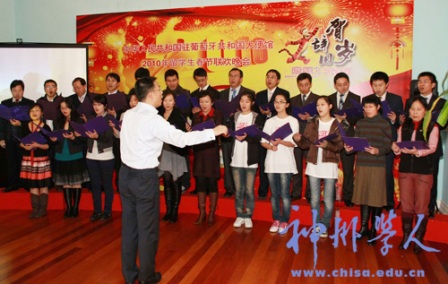隨后,聯歡晚會在《我和我的祖國》的歌聲中拉開了序幕。留學生們和使館工作人員獻上了形式多樣的節目:舞蹈《蒙古舞》、《金梭和銀梭》,小品《吃面》、《賣拐》,男聲獨唱《故鄉的云》,女聲獨唱《父老鄉親》,配樂詩朗誦《致橡樹》等等。精彩紛呈的表演時時引來熱烈的掌聲和喝彩聲,會場上始終洋溢著歡樂祥和的節日氣氛。
