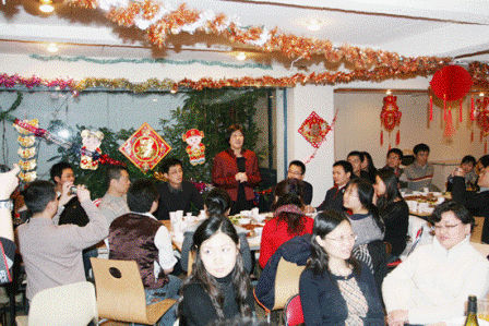 年夜飯后,教育處的老師與留學生們又組織了一臺自己的“春晚”。朱公參首先向虎年生人的老師和學生贈送了紀念品,由旅法畫家李中耀設計的法國虎年郵票5連張。朱公參和老師們一起向大家演唱了《我和我的祖國》。作為音樂愛好者的戴天華老師在大家的熱烈要求下,還獻上了獨唱歌曲。學生們也是各顯其能。晚會上還進行了豐富的抽獎活動。虎年就在人們的歌聲、笑聲、歡樂聲中悄然而至了。(黃冠杰)